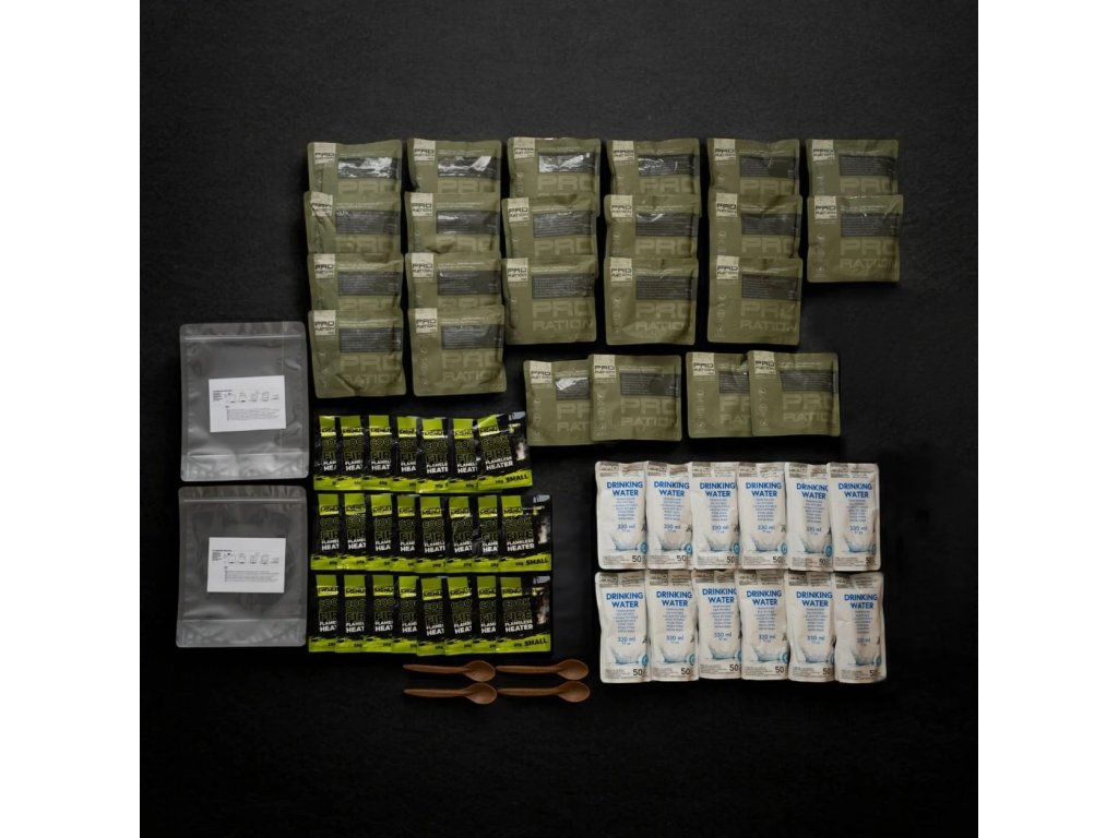Obsahuje 23 porcí plnohodnotného a chutného jídla – tedy kompletní zásobu pro čtyřčlennou rodinu na 72 hodin. Součástí balení je také samoohřev pro přípravu všech jídel bez potřeby vnějšího zdroje tepla a 12 sáčků s 330 ml pitné vody s trvanlivostí až 50 let.