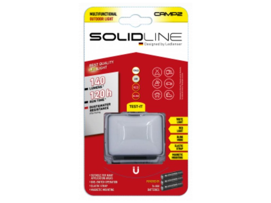 Solidline Camp2 je malé, praktické multifunkční světlo za dostupnou cenu. Ať už do kempu, na noční stolek nebo jako záloha pro všechny případy: Díky bílému světlu a červeným LED diodám nabízí Camp2 příjemné osvětlení. Disponuje chytrým uchycením - integrovaný magnet a elastická šňůra.