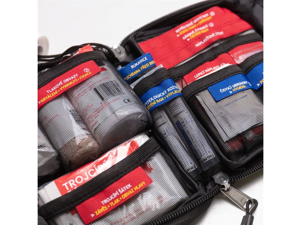 Medium KIT je sestaven tak, aby byl kompaktní, maximálně přehledný a snadno použitelný, což výrazně zlepšuje zvládnutí krizových situací — od drobných poranění až po náročnější úrazy.