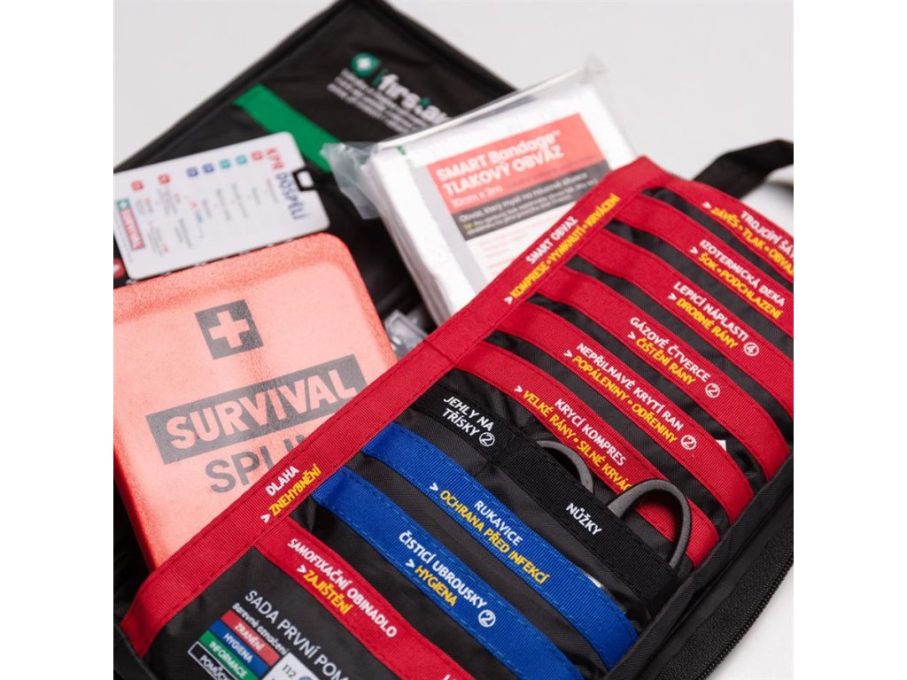 Stejně jako u ostatních produktů SURVIVAL je výbava uspořádána pomocí barevně rozlišeného systému. Každá sekce má svůj jasný účel (trauma / hygiena / pomůcky / informace) a kapsy jsou přehledně popsané, takže potřebný materiál najdete rychle a bez zdržení — i když jste v terénu, pod tlakem nebo máte jen jednu volnou ruku.