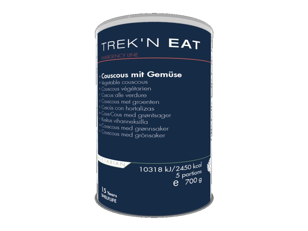 Marocký kuskus se zeleninou balený v plechové dóze. TREK'N EAT je chutné jídlo s důrazem na výživové hodnoty a pokrytí potřebné energie s vysokou dobou expirace. Jedná se o balení 5 porcí s celkovou hmotností v sušeném stavu 700 g (a cca 2000 g ve stavu po přípravě).