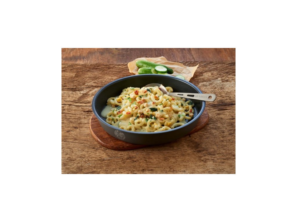 Těstoviny s křehkým kuřetem, smetanou a listovým špenátem balený v plechové dóze. TREK'N EAT je chutné jídlo s důrazem na výživové hodnoty a pokrytí potřebné energie s vysokou dobou expirace. Jedná se o balení 5 porcí s celkovou hmotností v sušeném stavu 500g (a cca 2150 g ve stavu po přípravě).