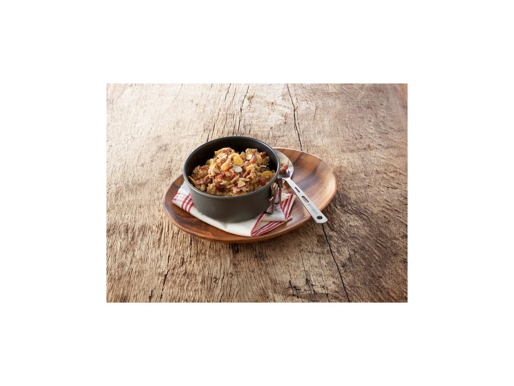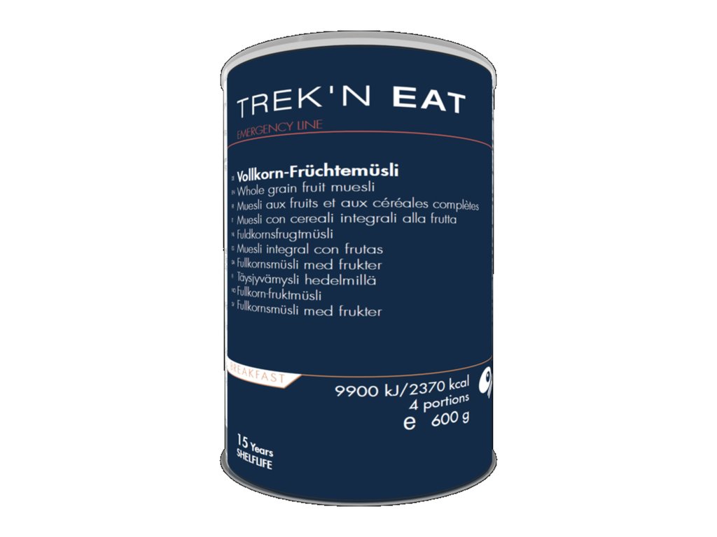 Celozrnné müsli s ovocem balené v plechové dóze. TREK'N EAT je chutné jídlo s důrazem na výživové hodnoty a pokrytí potřebné energie s vysokou dobou expirace.